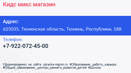 Кидс микс, магазин по адресу 625035, Тюменская область, Тюмень, Республики, 188 в дальнейшем Организация, размещена в следующих категориях: