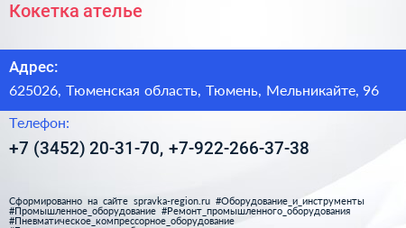 Кокетка, ателье по адресу 625026, Тюменская область, Тюмень, Мельникайте, 96 в дальнейшем Организация, размещена в следующих категориях: