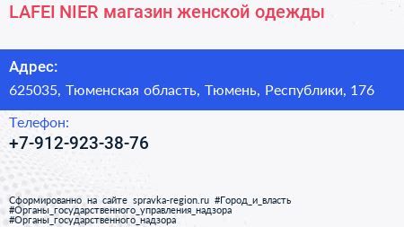 LAFEI-NIER, магазин женской одежды по адресу 625035, Тюменская область, Тюмень, Республики, 176 в дальнейшем Организация, размещена в следующих категориях:
