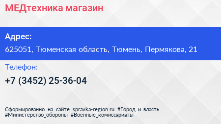 МЕДтехника, магазин по адресу 625051, Тюменская область, Тюмень, Пермякова, 21 в дальнейшем Организация, размещена в следующих категориях:
