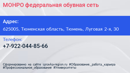 МОНРО, федеральная обувная сеть по адресу 625005, Тюменская область, Тюмень, Луговая 2-я, 30 в дальнейшем Организация, размещена в следующих категориях: