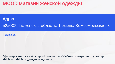 MOOD, магазин женской одежды по адресу 625002, Тюменская область, Тюмень, Комсомольская, 8 в дальнейшем Организация, размещена в следующих категориях: