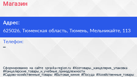 Магазин по адресу 625026, Тюменская область, Тюмень, Мельникайте, 113 в дальнейшем Организация, размещена в следующих категориях: