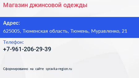 Магазин джинсовой одежды по адресу 625005, Тюменская область, Тюмень, Муравленко, 21 в дальнейшем Организация, размещена в следующих категориях: