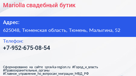 Mariolla, свадебный бутик по адресу 625048, Тюменская область, Тюмень, Малыгина, 52 в дальнейшем Организация, размещена в следующих категориях: