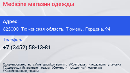 Medicine, магазин одежды по адресу 625000, Тюменская область, Тюмень, Герцена, 94 в дальнейшем Организация, размещена в следующих категориях: