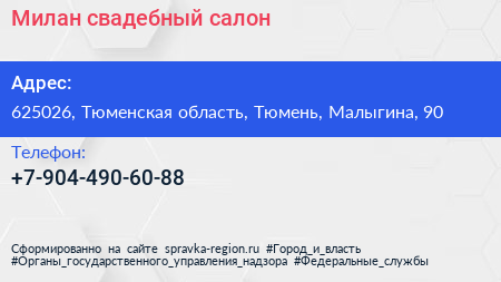 Милан, свадебный салон по адресу 625026, Тюменская область, Тюмень, Малыгина, 90 в дальнейшем Организация, размещена в следующих категориях: