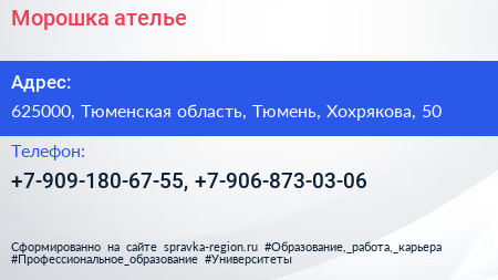 Морошка, ателье по адресу 625000, Тюменская область, Тюмень, Хохрякова, 50 в дальнейшем Организация, размещена в следующих категориях: