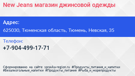 New Jeans, магазин джинсовой одежды по адресу 625030, Тюменская область, Тюмень, Невская, 35 в дальнейшем Организация, размещена в следующих категориях: