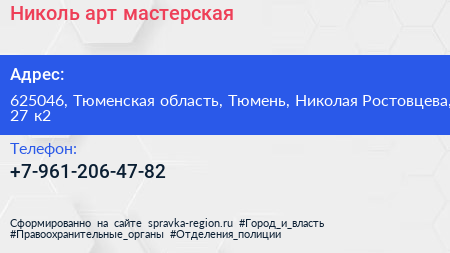 Николь, арт-мастерская по адресу 625046, Тюменская область, Тюмень, Николая Ростовцева, 27 к2 в дальнейшем Организация, размещена в следующих категориях: