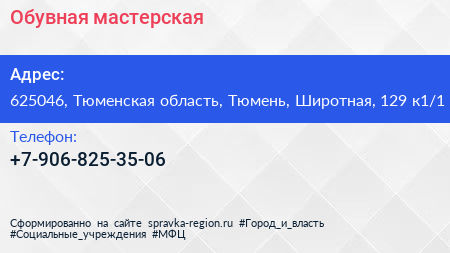 Обувная мастерская по адресу 625046, Тюменская область, Тюмень, Широтная, 129 к1/1 в дальнейшем Организация, размещена в следующих категориях: