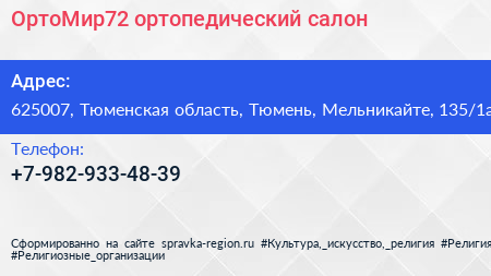 ОртоМир72, ортопедический салон по адресу 625007, Тюменская область, Тюмень, Мельникайте, 135/1а в дальнейшем Организация, размещена в следующих категориях: