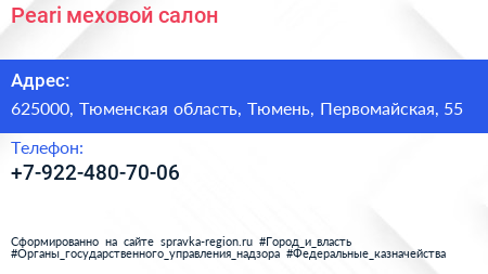 Peari, меховой салон по адресу 625000, Тюменская область, Тюмень, Первомайская, 55 в дальнейшем Организация, размещена в следующих категориях: