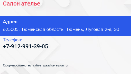 Салон-ателье по адресу 625005, Тюменская область, Тюмень, Луговая 2-я, 30 в дальнейшем Организация, размещена в следующих категориях: