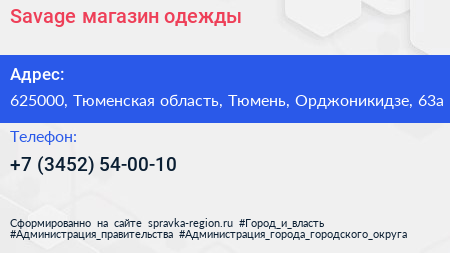 Savage, магазин одежды по адресу 625000, Тюменская область, Тюмень, Орджоникидзе, 63а в дальнейшем Организация, размещена в следующих категориях: