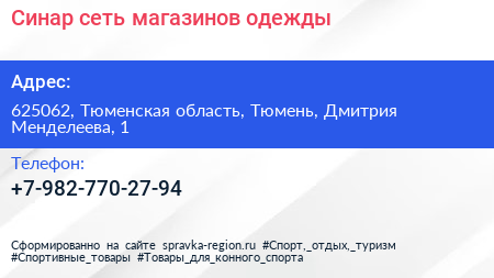 Синар, сеть магазинов одежды по адресу 625062, Тюменская область, Тюмень, Дмитрия Менделеева, 1 в дальнейшем Организация, размещена в следующих категориях: