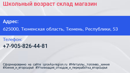 Школьный возраст, склад-магазин по адресу 625000, Тюменская область, Тюмень, Республики, 53 в дальнейшем Организация, размещена в следующих категориях: