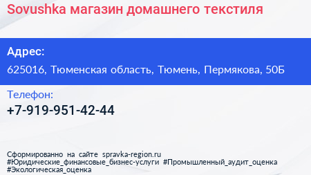 Sovushka, магазин домашнего текстиля по адресу 625016, Тюменская область, Тюмень, Пермякова, 50Б в дальнейшем Организация, размещена в следующих категориях: