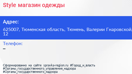Style, магазин одежды по адресу 625007, Тюменская область, Тюмень, Валерии Гнаровской, 12 в дальнейшем Организация, размещена в следующих категориях: