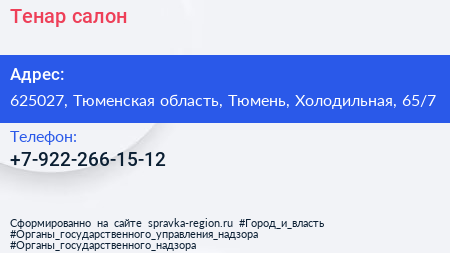 Тенар, салон по адресу 625027, Тюменская область, Тюмень, Холодильная, 65/7 в дальнейшем Организация, размещена в следующих категориях: