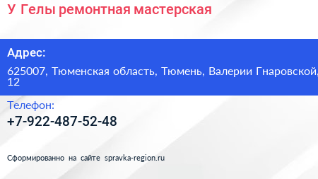 У Гелы, ремонтная мастерская по адресу 625007, Тюменская область, Тюмень, Валерии Гнаровской, 12 в дальнейшем Организация, размещена в следующих категориях: