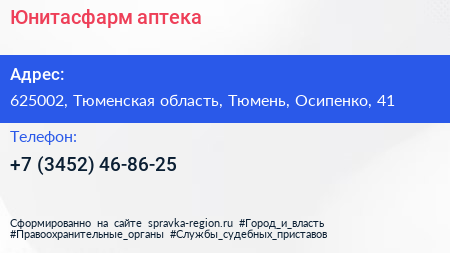 Юнитасфарм, аптека по адресу 625002, Тюменская область, Тюмень, Осипенко, 41 в дальнейшем Организация, размещена в следующих категориях:
