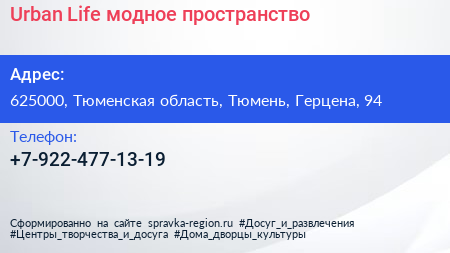 Urban Life, модное пространство по адресу 625000, Тюменская область, Тюмень, Герцена, 94 в дальнейшем Организация, размещена в следующих категориях: