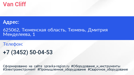 Van Cliff по адресу 625062, Тюменская область, Тюмень, Дмитрия Менделеева, 1 в дальнейшем Организация, размещена в следующих категориях: