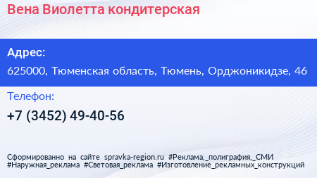 Вена-Виолетта, кондитерская по адресу 625000, Тюменская область, Тюмень, Орджоникидзе, 46 в дальнейшем Организация, размещена в следующих категориях: