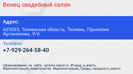 Венец, свадебный салон по адресу 625033, Тюменская область, Тюмень, Прокопия Артамонова, 9/6 в дальнейшем Организация, размещена в следующих категориях: