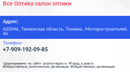 Все Оптика, салон оптики по адресу 625046, Тюменская область, Тюмень, Моторостроителей, 4а в дальнейшем Организация, размещена в следующих категориях: