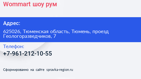 Wommart, шоу-рум по адресу 625026, Тюменская область, Тюмень, проезд Геологоразведчиков, 7 в дальнейшем Организация, размещена в следующих категориях: