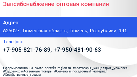 Запсибснабжение, оптовая компания по адресу 625027, Тюменская область, Тюмень, Республики, 141 в дальнейшем Организация, размещена в следующих категориях: