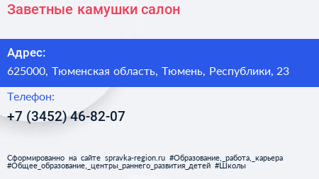 Заветные камушки, салон по адресу 625000, Тюменская область, Тюмень, Республики, 23 в дальнейшем Организация, размещена в следующих категориях: