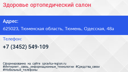 Здоровье, ортопедический салон по адресу 625023, Тюменская область, Тюмень, Одесская, 48а в дальнейшем Организация, размещена в следующих категориях: