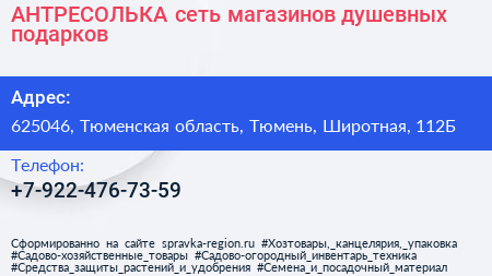 АНТРЕСОЛЬКА, сеть магазинов душевных подарков по адресу 625046, Тюменская область, Тюмень, Широтная, 112Б в дальнейшем Организация, размещена в следующих категориях: