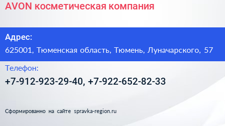 AVON, косметическая компания по адресу 625001, Тюменская область, Тюмень, Луначарского, 57 в дальнейшем Организация, размещена в следующих категориях: