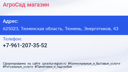 АгроСад, магазин по адресу 625023, Тюменская область, Тюмень, Энергетиков, 43 в дальнейшем Организация, размещена в следующих категориях: