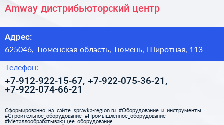 Amway, дистрибьюторский центр по адресу 625046, Тюменская область, Тюмень, Широтная, 113 в дальнейшем Организация, размещена в следующих категориях: