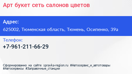 Арт-букет, сеть салонов цветов по адресу 625002, Тюменская область, Тюмень, Осипенко, 39а в дальнейшем Организация, размещена в следующих категориях: