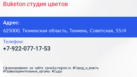 Buketon, студия цветов по адресу 625000, Тюменская область, Тюмень, Советская, 55/4 в дальнейшем Организация, размещена в следующих категориях: