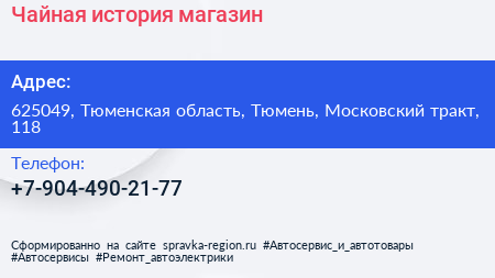 Чайная история, магазин по адресу 625049, Тюменская область, Тюмень, Московский тракт, 118 в дальнейшем Организация, размещена в следующих категориях: