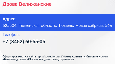 Дрова Велижанские по адресу 625504, Тюменская область, Тюмень, Новая озёрная, 56Б в дальнейшем Организация, размещена в следующих категориях: