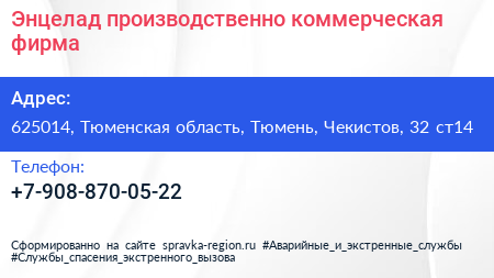 Энцелад, производственно-коммерческая фирма по адресу 625014, Тюменская область, Тюмень, Чекистов, 32 ст14 в дальнейшем Организация, размещена в следующих категориях: