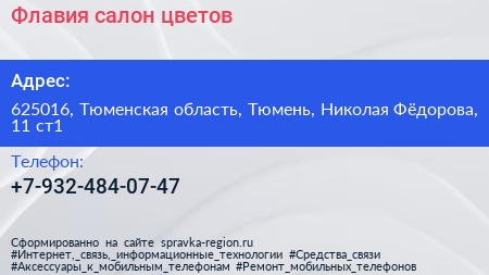 Флавия, салон цветов по адресу 625016, Тюменская область, Тюмень, Николая Фёдорова, 11 ст1 в дальнейшем Организация, размещена в следующих категориях: