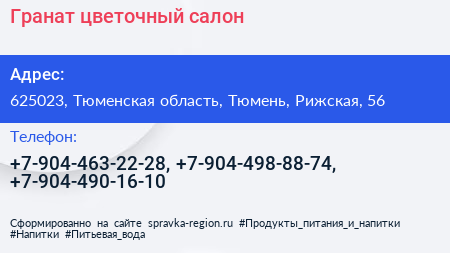 Гранат, цветочный салон по адресу 625023, Тюменская область, Тюмень, Рижская, 56 в дальнейшем Организация, размещена в следующих категориях: