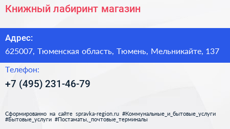Книжный лабиринт, магазин по адресу 625007, Тюменская область, Тюмень, Мельникайте, 137 в дальнейшем Организация, размещена в следующих категориях: