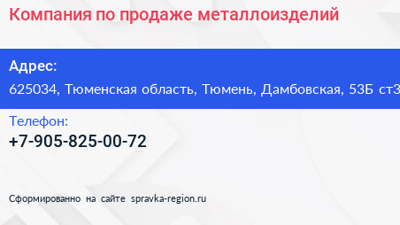 Компания по продаже металлоизделий по адресу 625034, Тюменская область, Тюмень, Дамбовская, 53Б ст3 в дальнейшем Организация, размещена в следующих категориях: