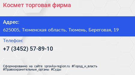 Космет, торговая фирма по адресу 625005, Тюменская область, Тюмень, Береговая, 19 в дальнейшем Организация, размещена в следующих категориях: