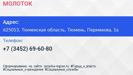 МОЛОТОК по адресу 625013, Тюменская область, Тюмень, Пермякова, 1а в дальнейшем Организация, размещена в следующих категориях: